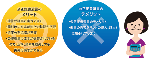 「秘密証書遺言」とは、遺言の内容は公開せずに、遺言書の存在のみを明確にする遺言です。 遺言者は、まず遺言書を作成し、封をします。公証役場に出向き、公証人と証人2人の前で自身の遺言書であることを申し述べ、公証人による必要事項の記載、遺言者、証人2人による署名、捺印によって完成します。 ワープロで作成したり、第三者が筆記することも可能です。